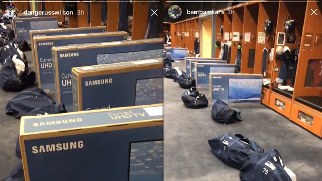 Seahawks Quarterback Russell Wilson surprised his offensive linemen today with brand new Samsung curved-screen televisions and even hooked the entire team up with first-class airline tickets to fly wherever they want.